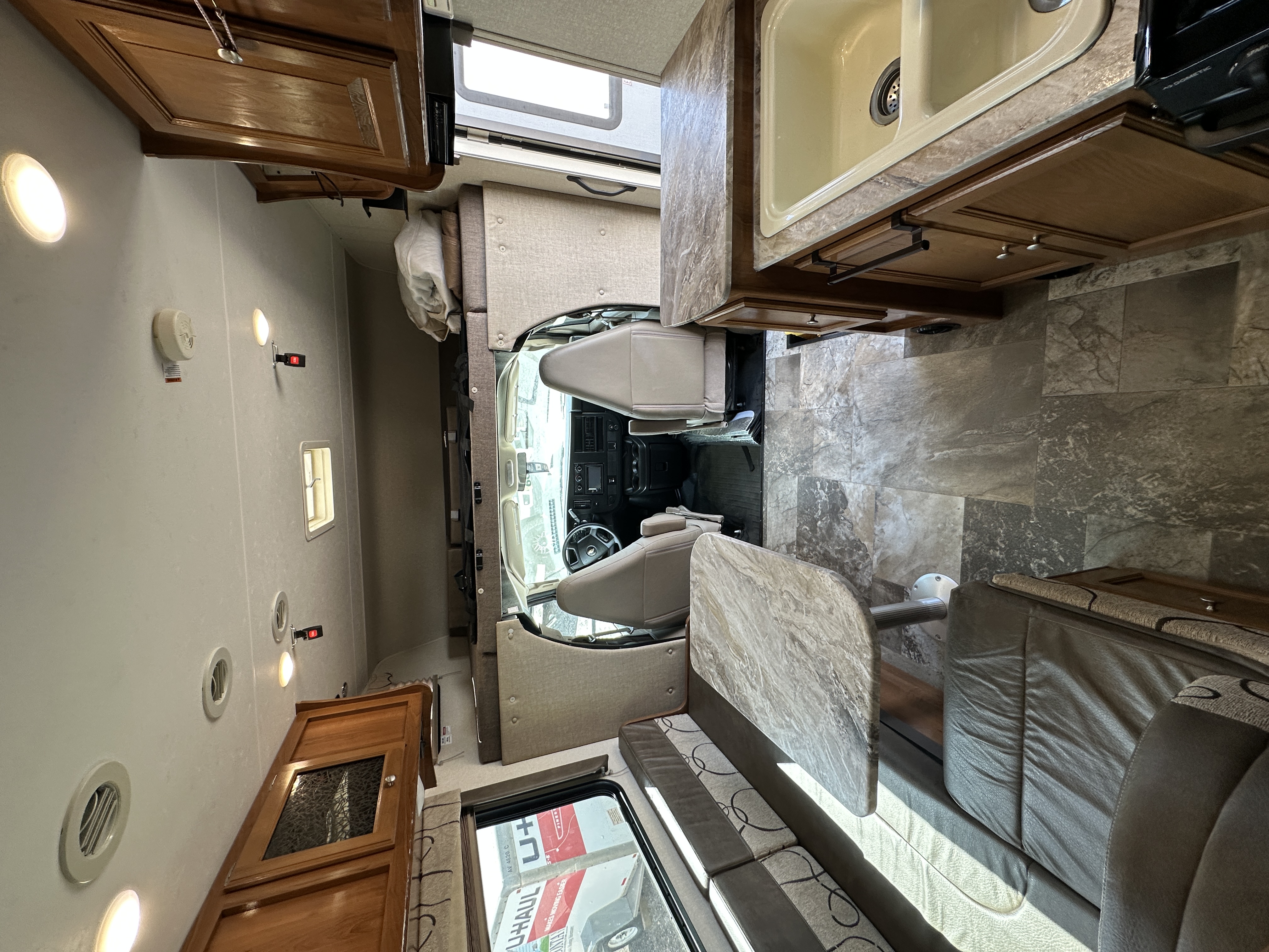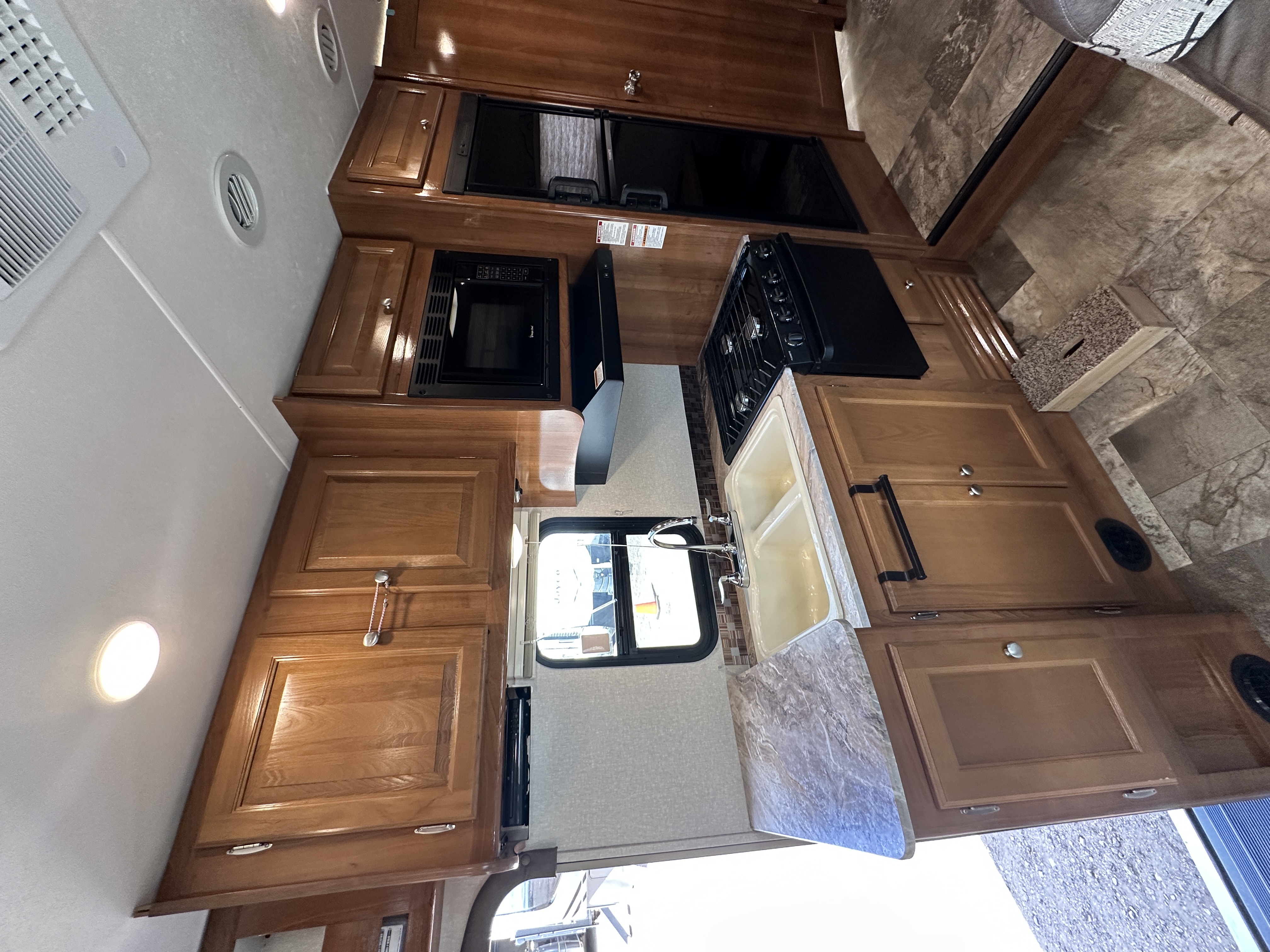 Interior: J-Dinette, rear queen bed, front cab-over bunk, 3-burner cooktop, 13,500 BTU roof A/C