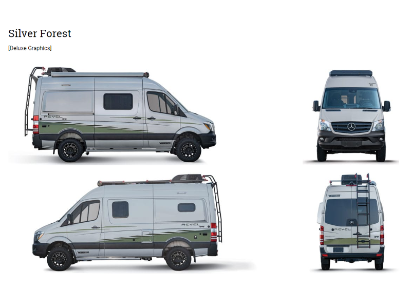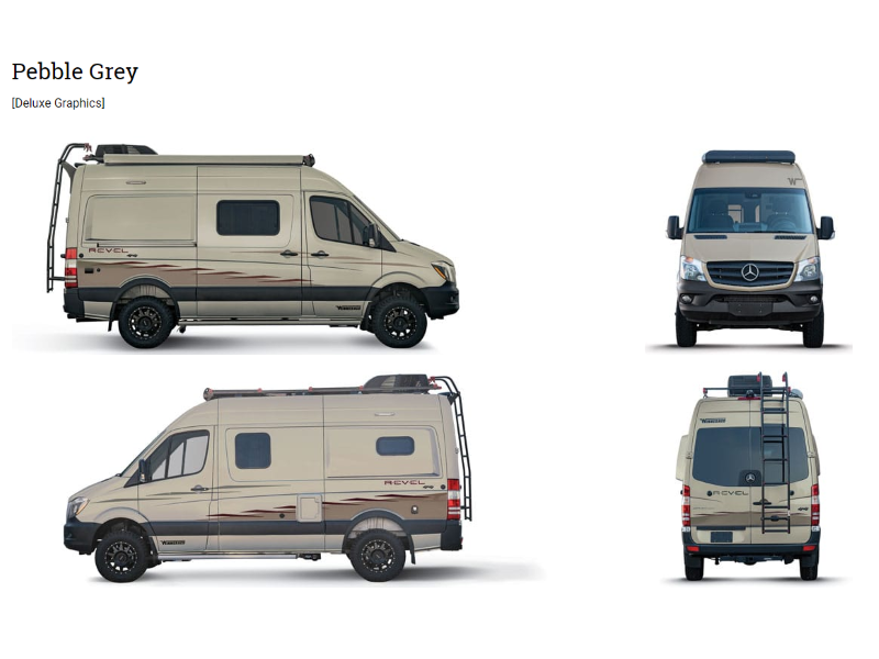 Designed specifically for active outdoor enthusiasts, the all-new Winnebago Revel takes a no-nonsense approach to adventure, with a straightforward design and function-driven features. Taking full advantage of the proven 4x4 Mercedes-Benz Sprinter chassis, the Revels 3-liter turbo-diesel puts 325 lbs./ft. of torque through an on-demand 4WD system, complete with high/low range mode for added off-road capability. Inside, the Revels unique features start with a floorplan designed around a 140-cu. ft. gear garage with a power lift bed. A full galley, including a 2.5-cu. ft. compressor refrigerator, makes meal prep a breeze, while the all-in-one wet bath and gear closet boasts a cassette-style toilet that eliminates the need for a separate black water holding tank. Add a standard 200-watt solar power system, diesel-powered heating, a dinette with a pull-up table that converts to additional sleeping space, and many more innovative features and the result is the new Revel: quite simply the most off-road capable RV Winnebago has ever built.