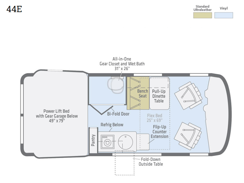 Storage and sleeping space are maximized by the body flares and Power Lift Bed with a Gear Garage. Welded aluminum cabinet face frames, dual-pane acrylic windows with insulated shades, and a standard solar power system all contribute to the 44E's off-grid livability.