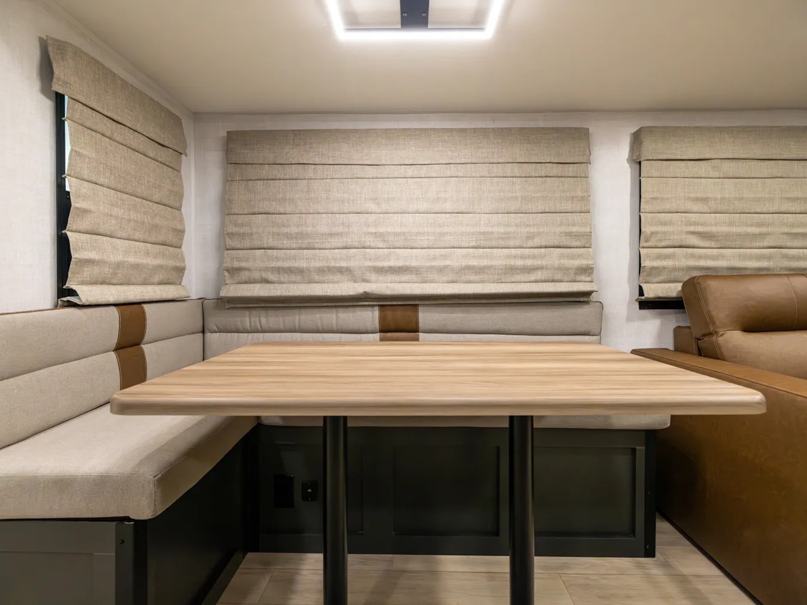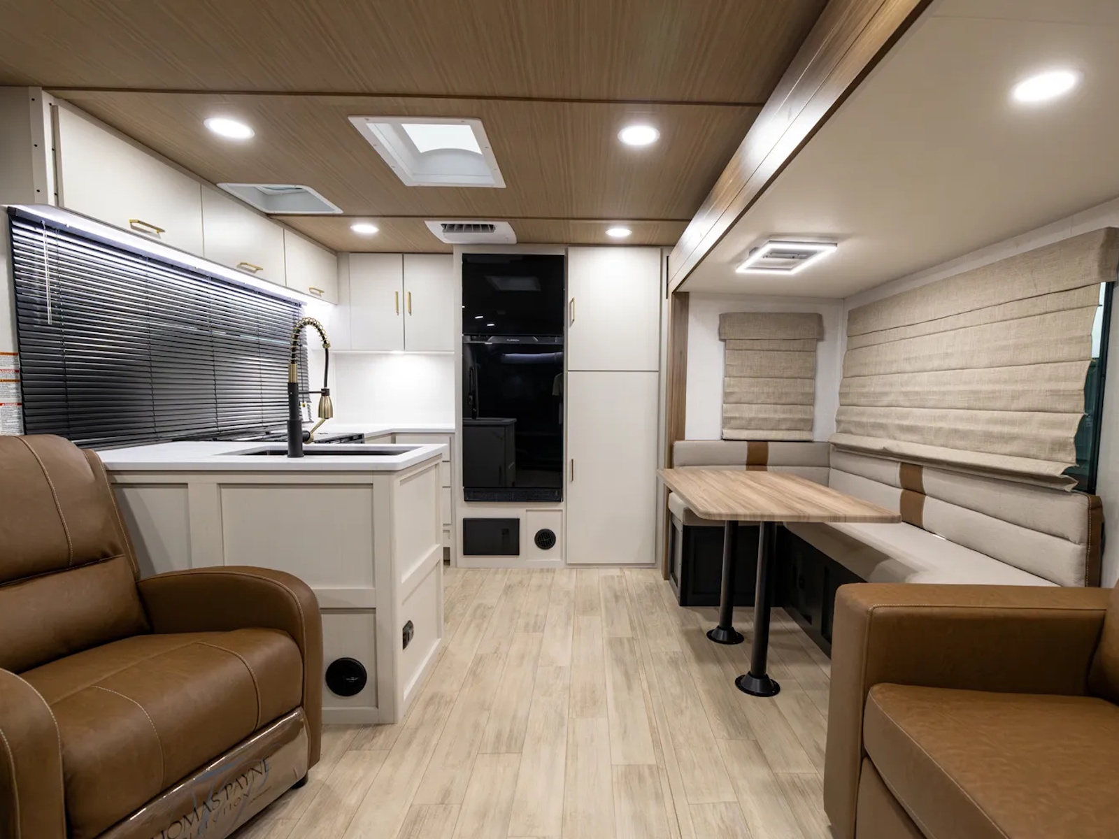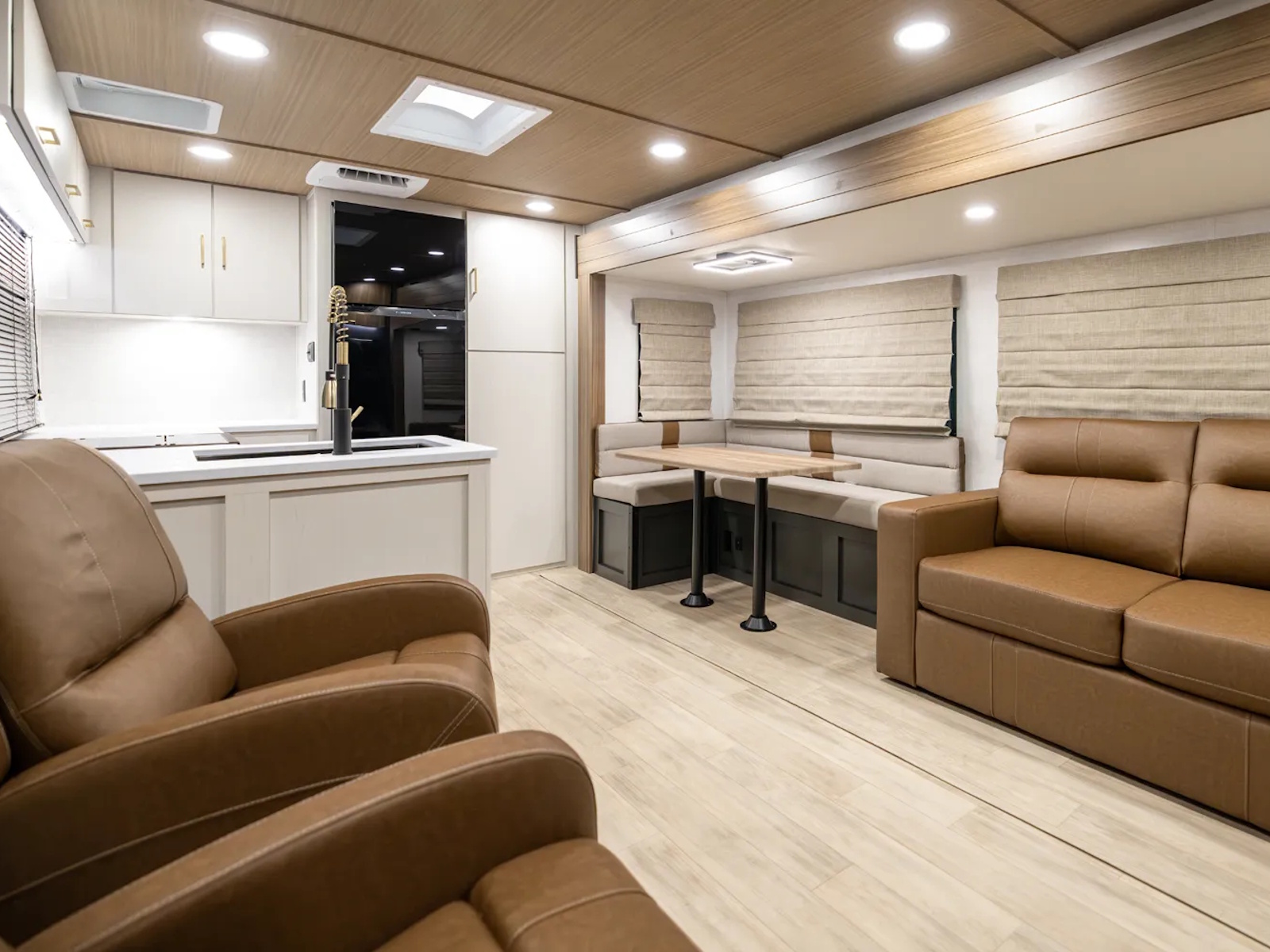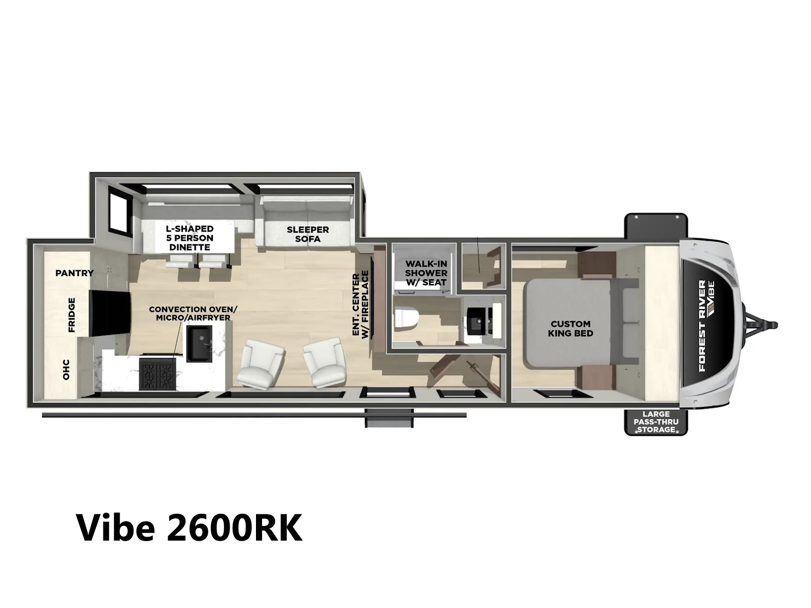 The 2600RK is a popular floorplan as we deliver a spacious rear kitchen with an ample amount of natural light and windows. This floorplan has a lot of energy focused on quality time with the family as the 2600RK comes complete with a 5-person dinette, tri-fold sofa (turns into bed), and two separate recliner chairs all within view of the kitchen. With a king bed and washer/dryer prep this lightweight coach offers more functional space than ever.
