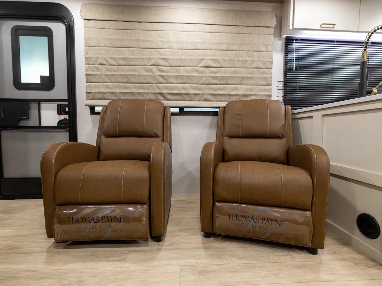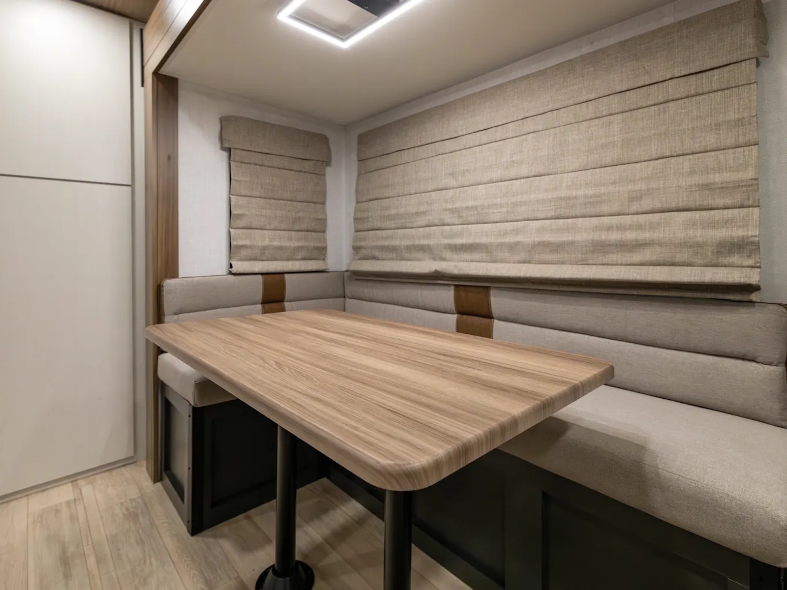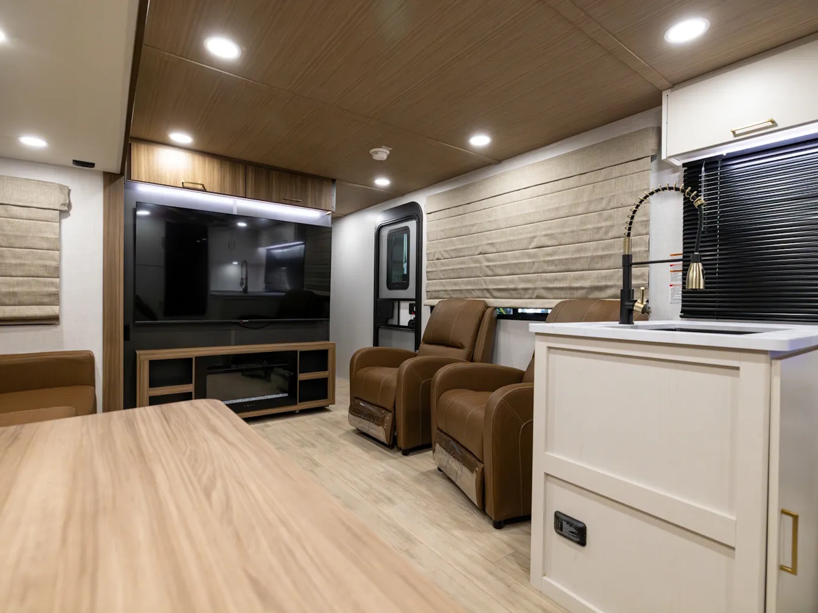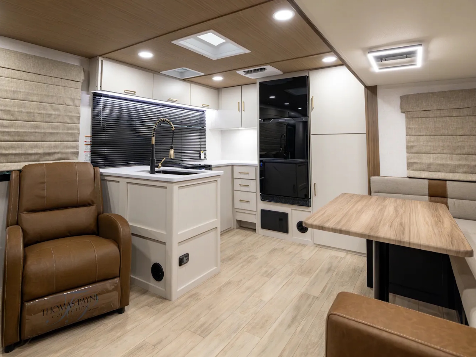 The 2600RK is a popular floorplan as we deliver a spacious rear kitchen with an ample amount of natural light and windows. This floorplan has a lot of energy focused on quality time with the family as the 2600RK comes complete with a 5-person dinette, tri-fold sofa (turns into bed), and two separate recliner chairs all within view of the kitchen. With a king bed and washer/dryer prep this lightweight coach offers more functional space than ever.