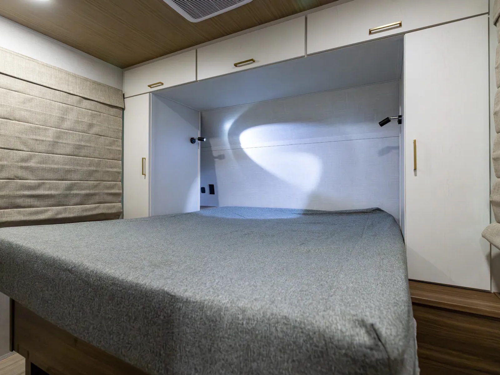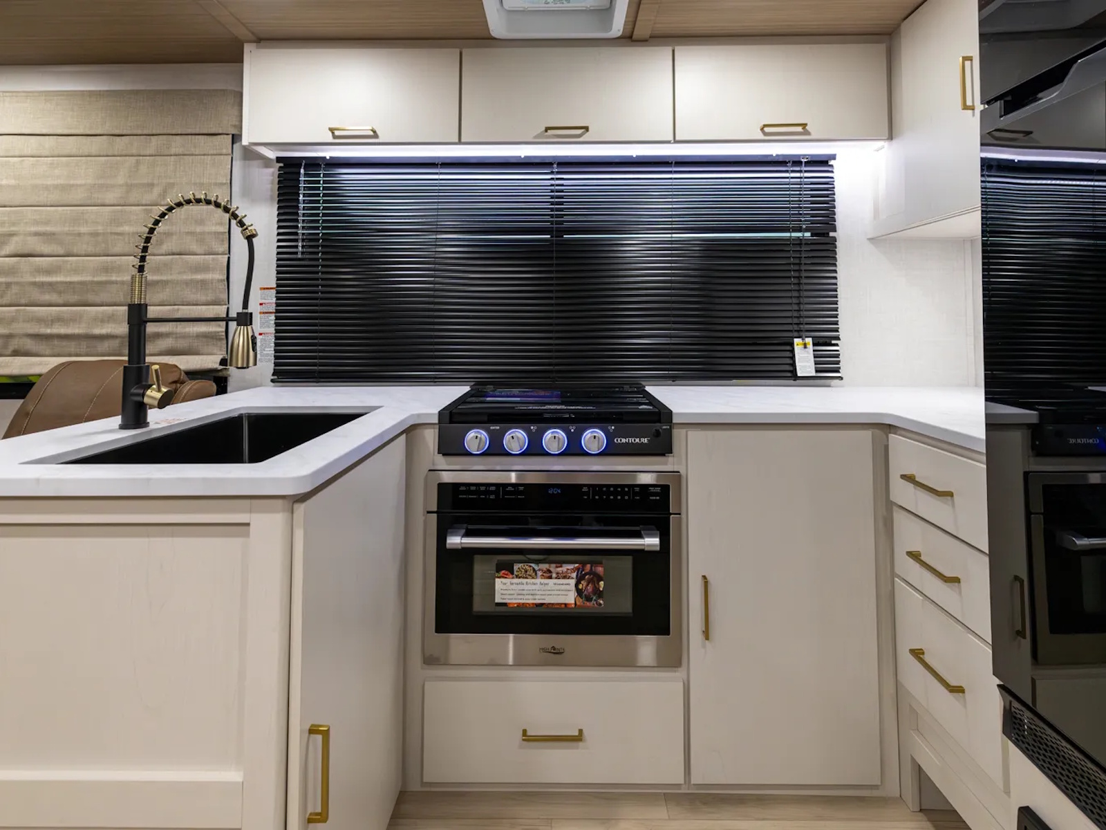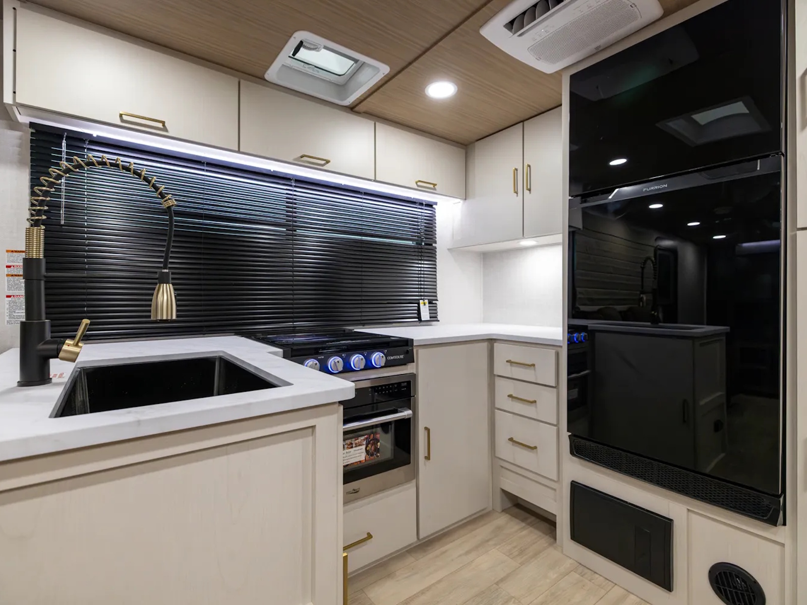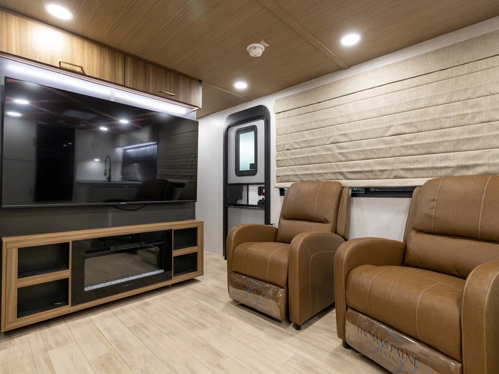 The 2600RK is a popular floorplan as we deliver a spacious rear kitchen with an ample amount of natural light and windows. This floorplan has a lot of energy focused on quality time with the family as the 2600RK comes complete with a 5-person dinette, tri-fold sofa (turns into bed), and two separate recliner chairs all within view of the kitchen. With a king bed and washer/dryer prep this lightweight coach offers more functional space than ever.