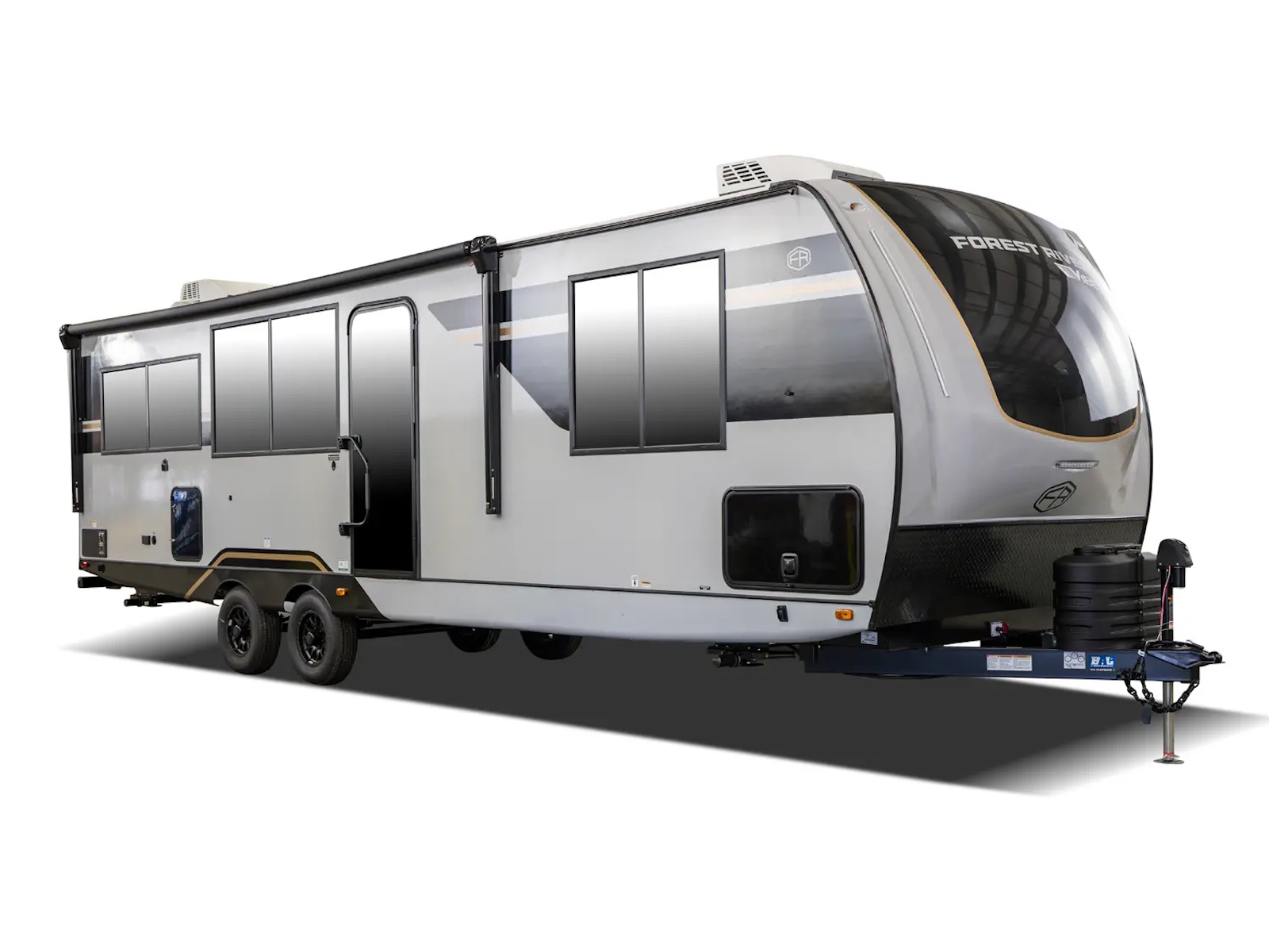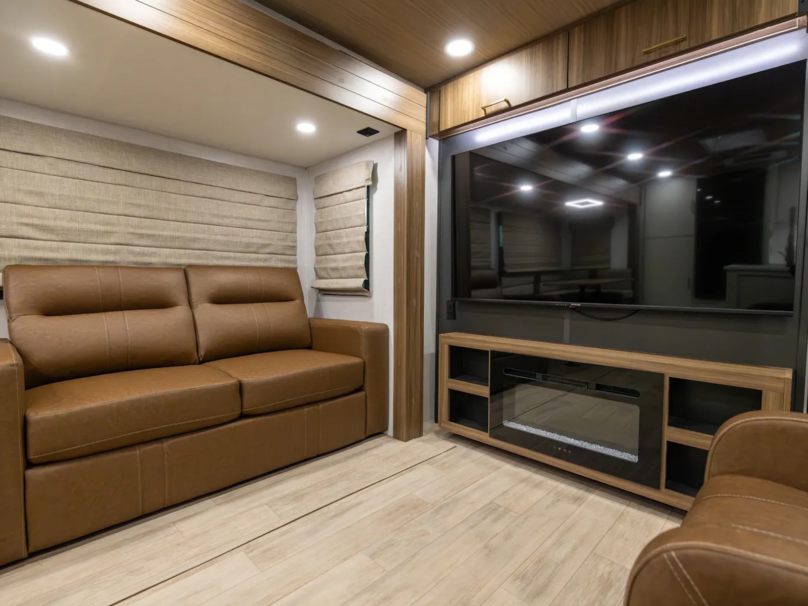 - Universal Docking Station Enclosed in Cargo Storage - Hookups Included: Cable & Satellite Switch, Fresh-Tank Gravity Fill, City Water, Black Tank Flush, Winterization Pump, Outdoor Shower, GFI Outlet, And Space Prepped for Solar Panel Controller